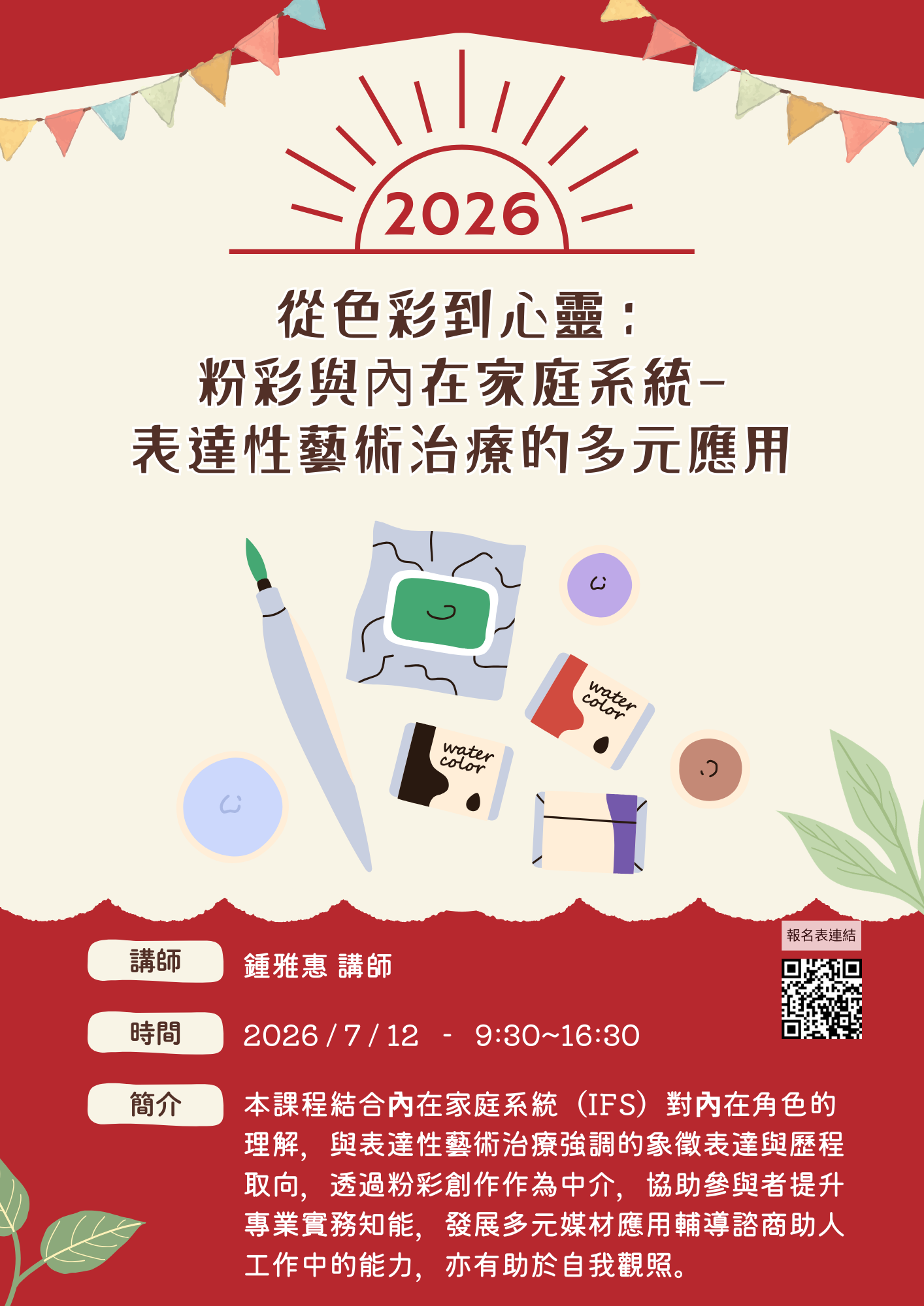 本課程結合內在家庭系統(IFS)對內在角色的理解,與表達性藝術治療強調的象徵表達與歷程取向,透過粉彩創作作為中介,協助參與者提升專業實務知能,發展多元媒材應用輔導諮商助人工作中的能力,亦有助於自我觀照。。