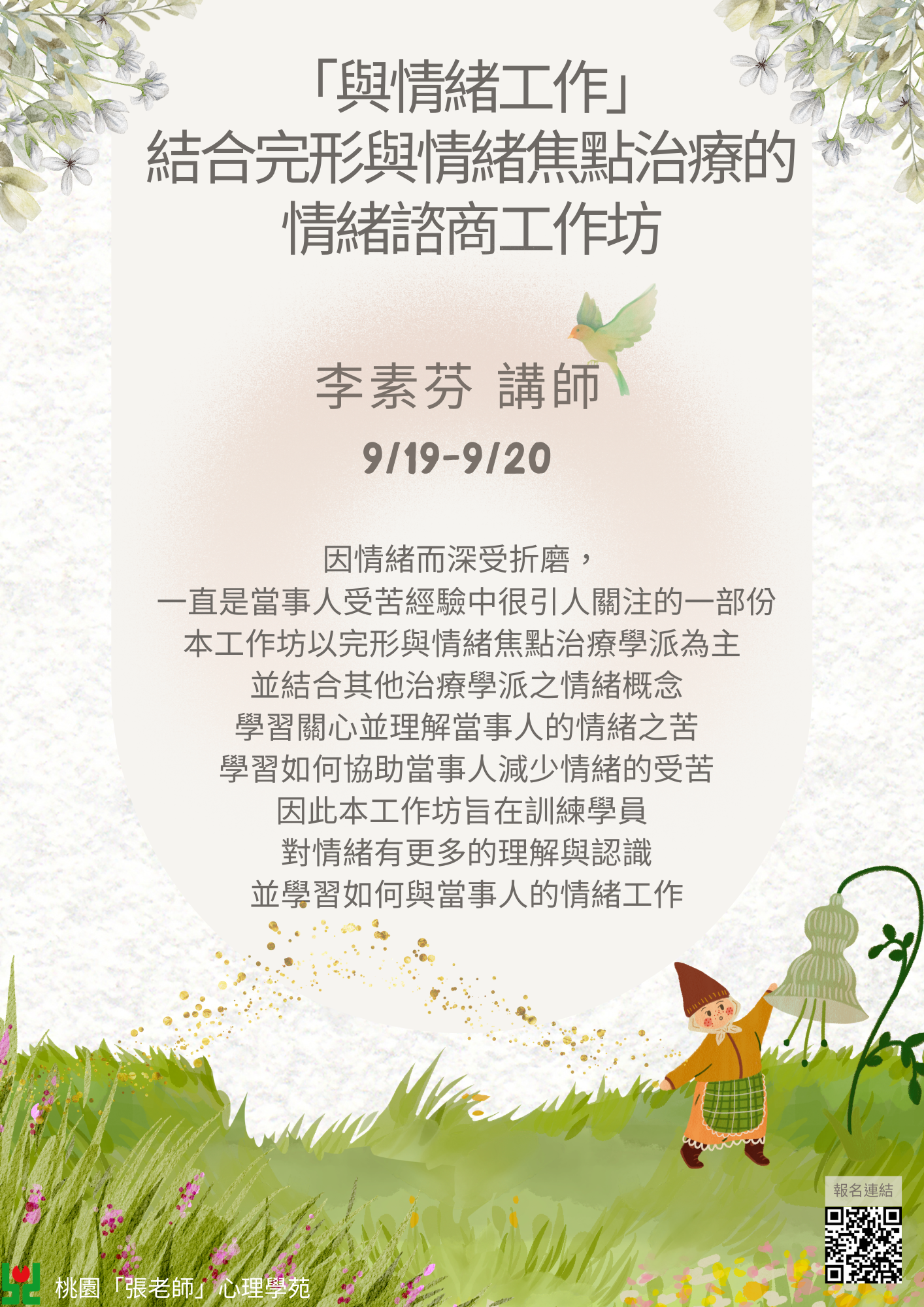 | 課程名稱: | 與情緒工作-結合完形與情緒焦點治療的情緒取向治療工作坊 |