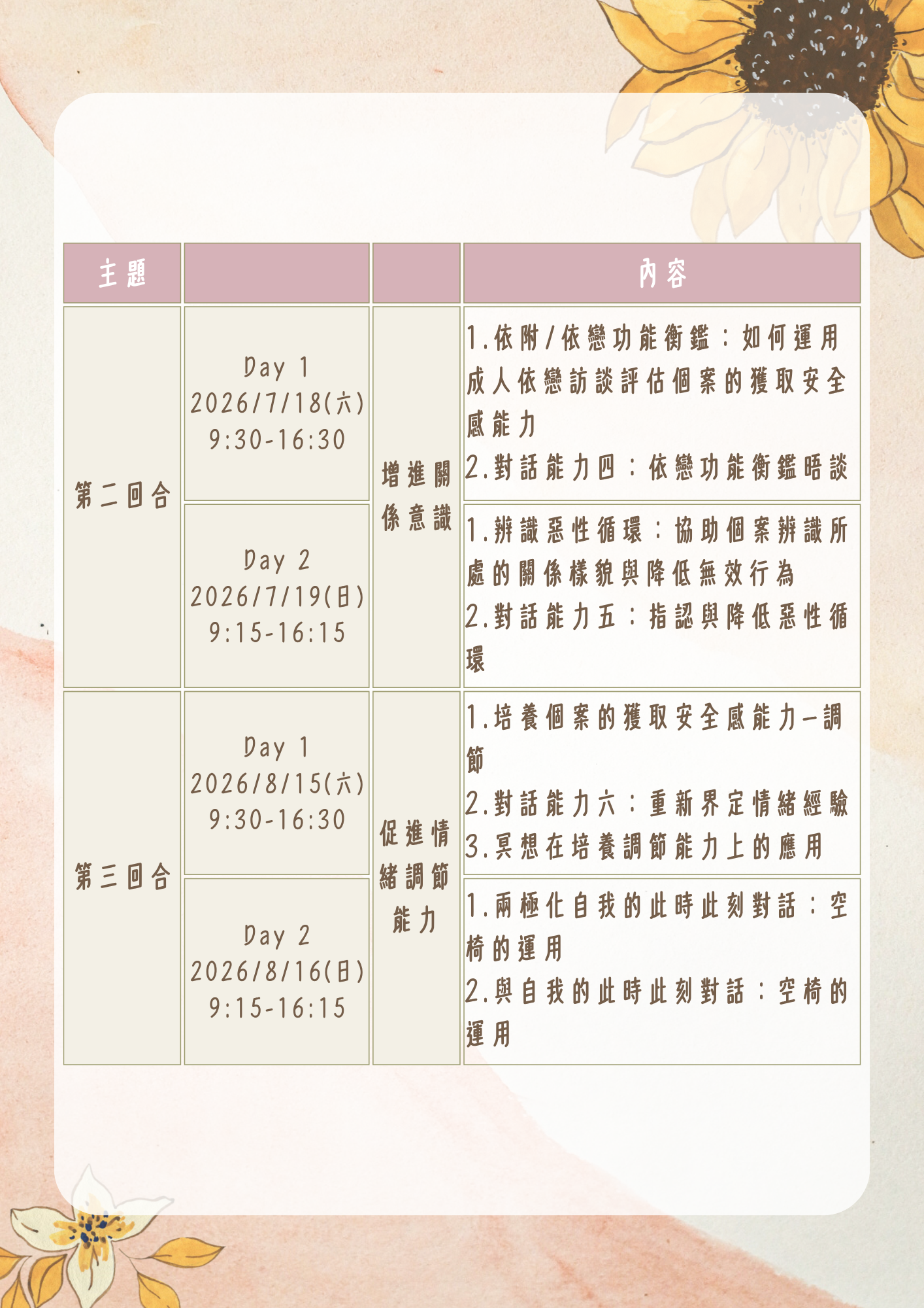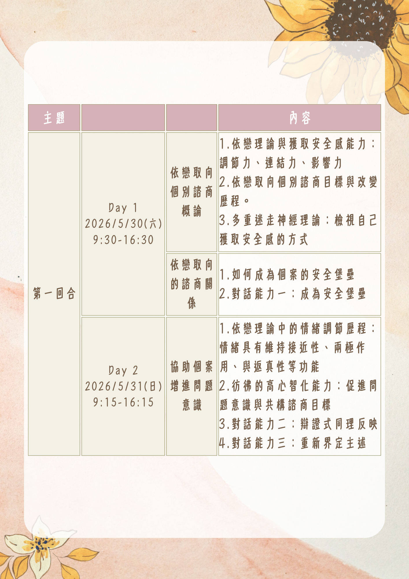 | 課程名稱: | 【高雄】依戀取向個別諮商實務工作坊—四回合課程 |