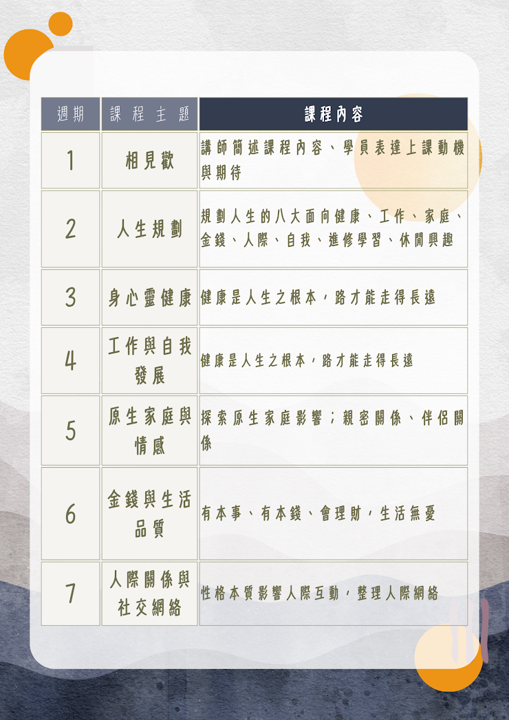| 課程介紹: | 官網報名不代表報名成功,請詳閱簡章內容及點入 報名網址:https://forms.gle/5cd2jQLcrdrs8Fyy6進行報名 讓生活與工作平衡、擁有身心健康,能靈活調適各種生活壓力,重拾生命的