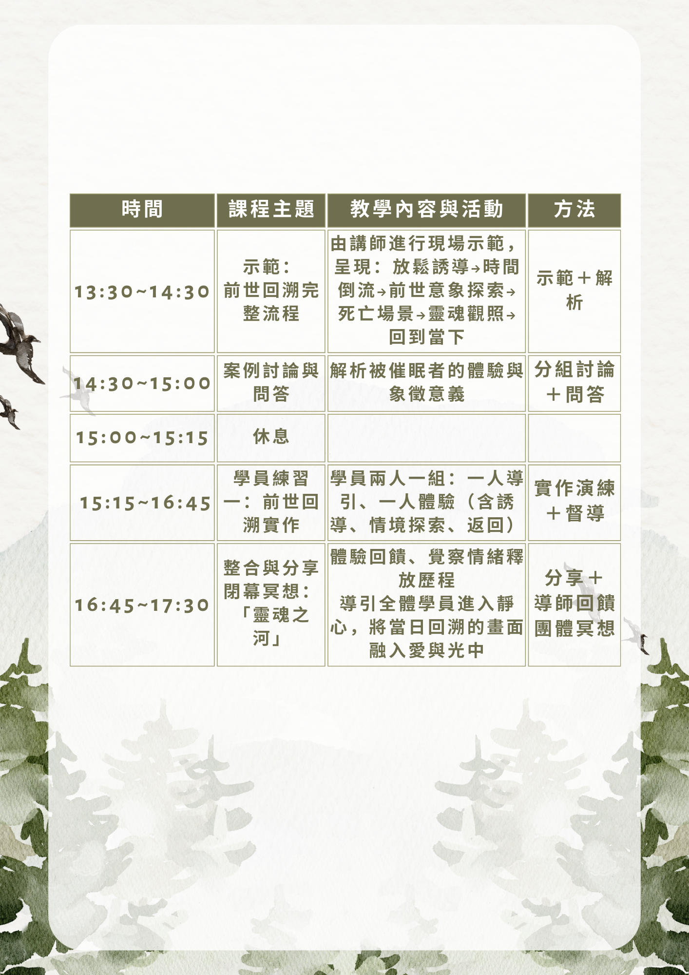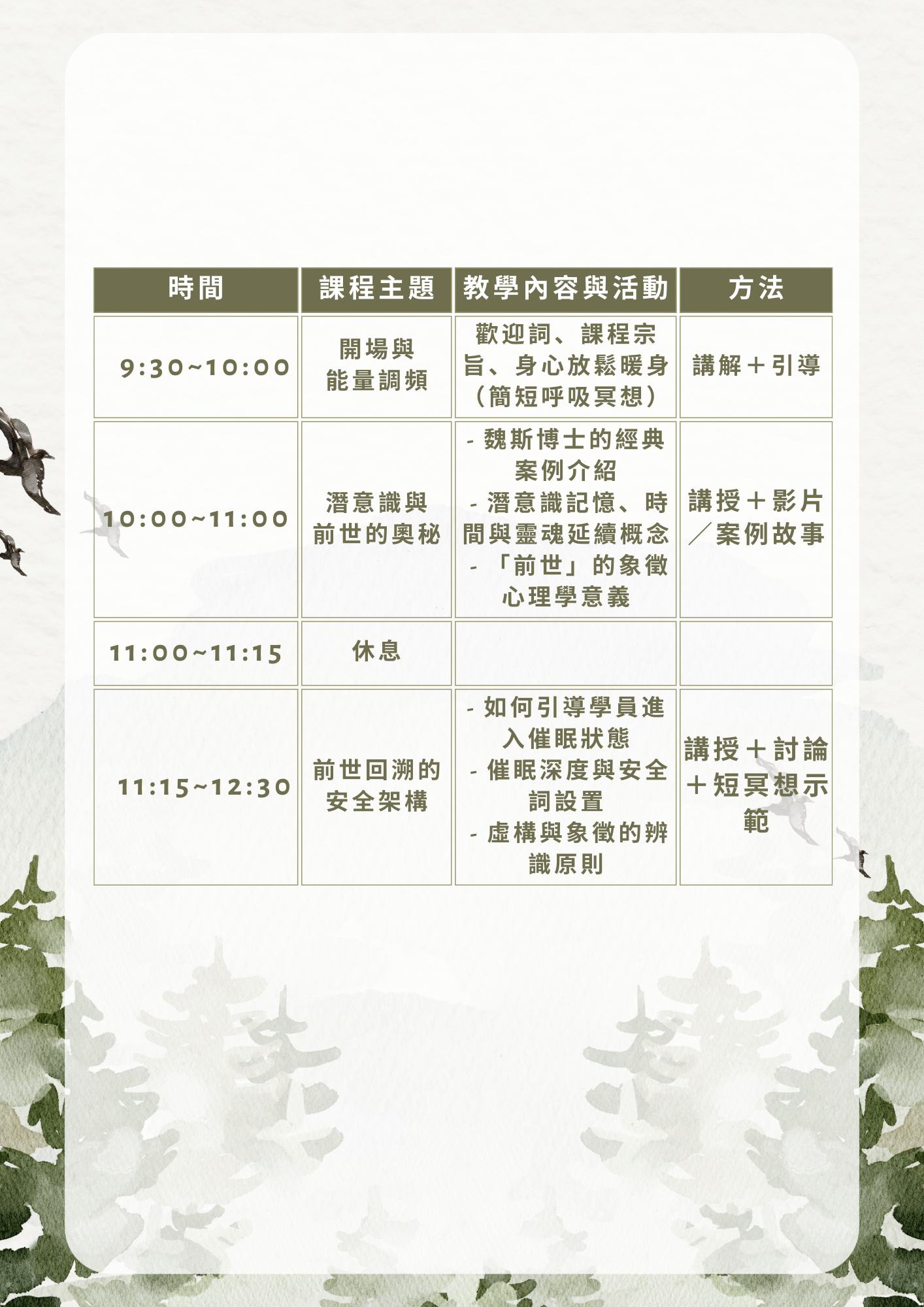 | 課程介紹: | 官網報名不代表報名成功,請詳閱簡章內容及點入 報名網址:https://forms.gle/xx2JMySASNoH3csw6進行報名 打開靈魂記憶之門→認識潛意識與前世理論、建立安全催眠狀態、進行首次回溯體驗