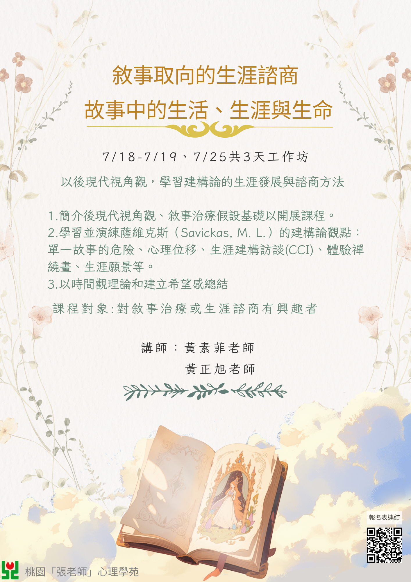 | 課程名稱: | 敘事取向的生涯諮商—-故事中的生活、生涯與生命 工作坊 |