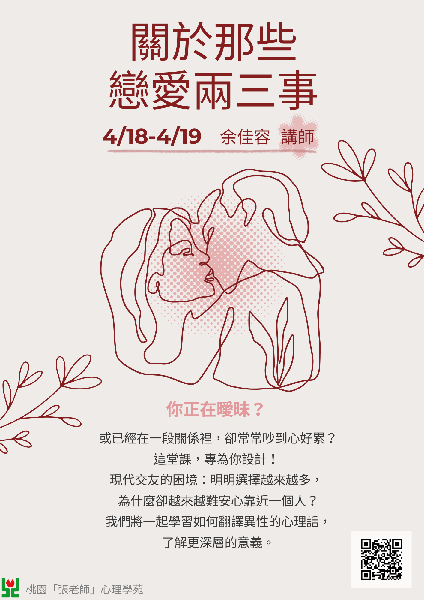 【研習內容】 你正在曖昧?剛在試探對方?或已經在一段關係裡,卻常常吵到心很累?這堂課就是為你設計的。 我們會一起聊最真實的現代交友困境:明明選擇越來越多,為什麼越來越難安心靠近一個人?你將會一起來學習如何翻譯異性的心理話,學會了解更深層的意。接著,我們把鏡頭拉進關係裡:為什麼我在表達,對方卻聽成攻擊?為什麼同一句話可以讓人覺得被在乎,也可以讓人覺得被情緒勒索?課程會帶你看見男女(或任何親密組合)之間常見的誤解來源,並用實際練習教你怎麼講,對方才真的聽得進去。 最後,我們一起做「關係紅綠燈」和「價值觀拍賣」活動,幫你釐清三件事:我在找怎樣的關係?我能給出什麼?什麼是我一定要守住的界線? |
