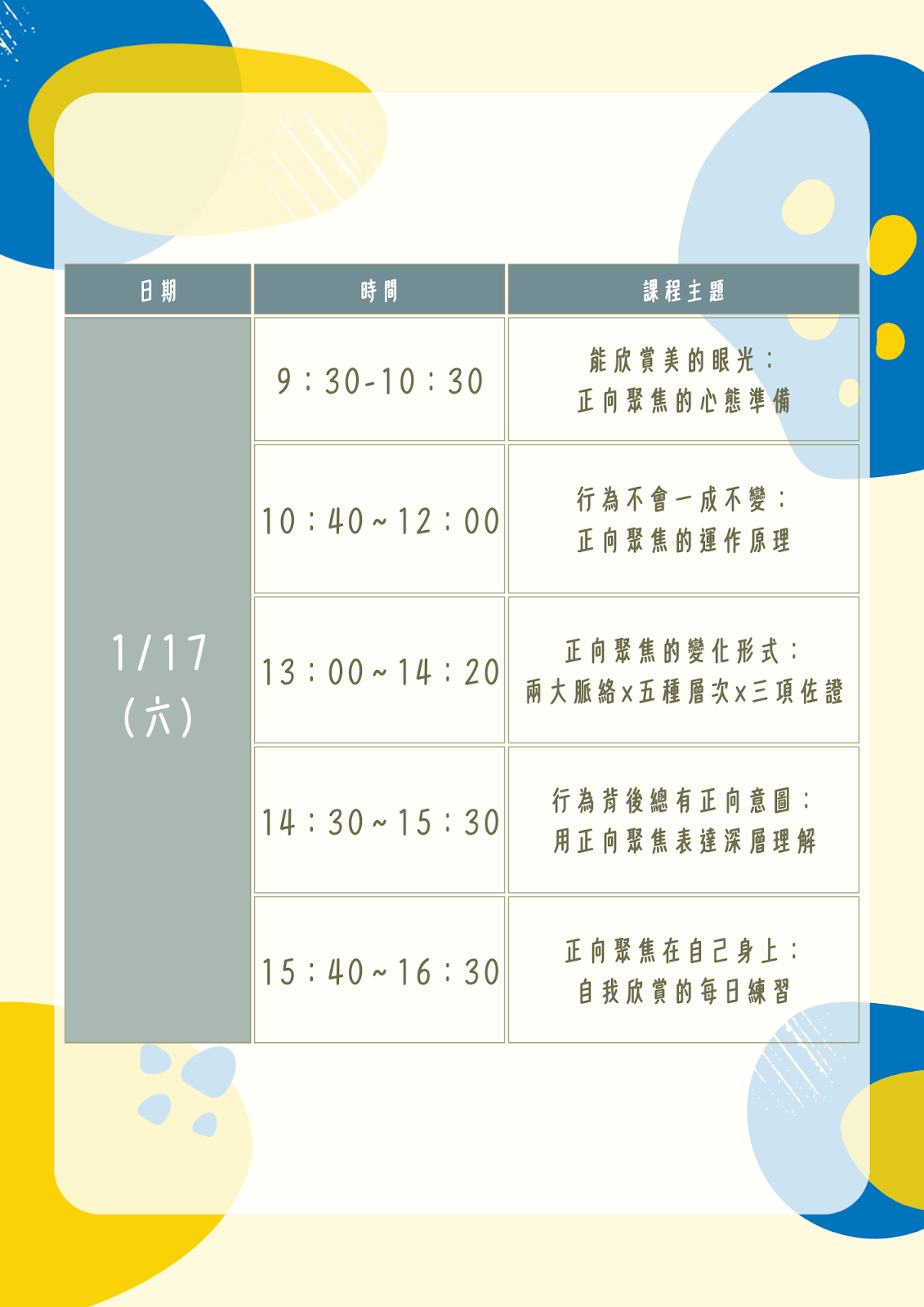 日期 | 115年01月17日(六)9:30-16:30(中午休息1小時),一天共計6小時。 |