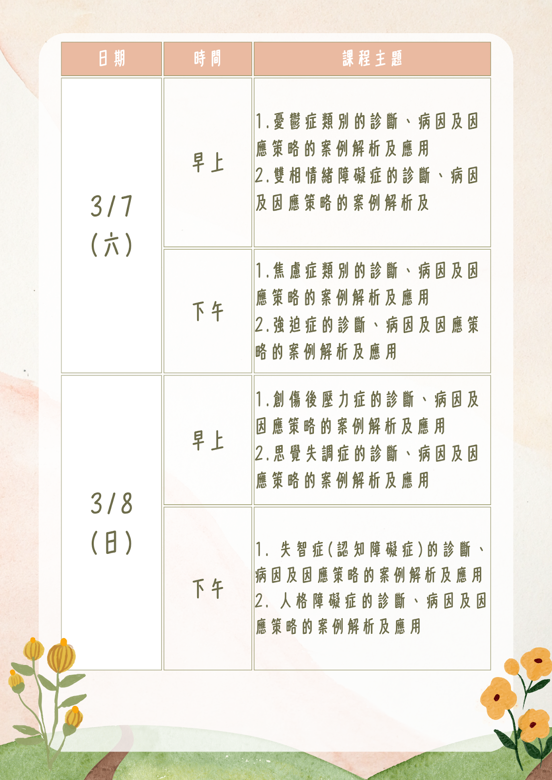 | 課程名稱: | 【高雄】常見精神疾病的案例解析:諮商該知道的DSM-5 TR診斷、病因及因應策略 |