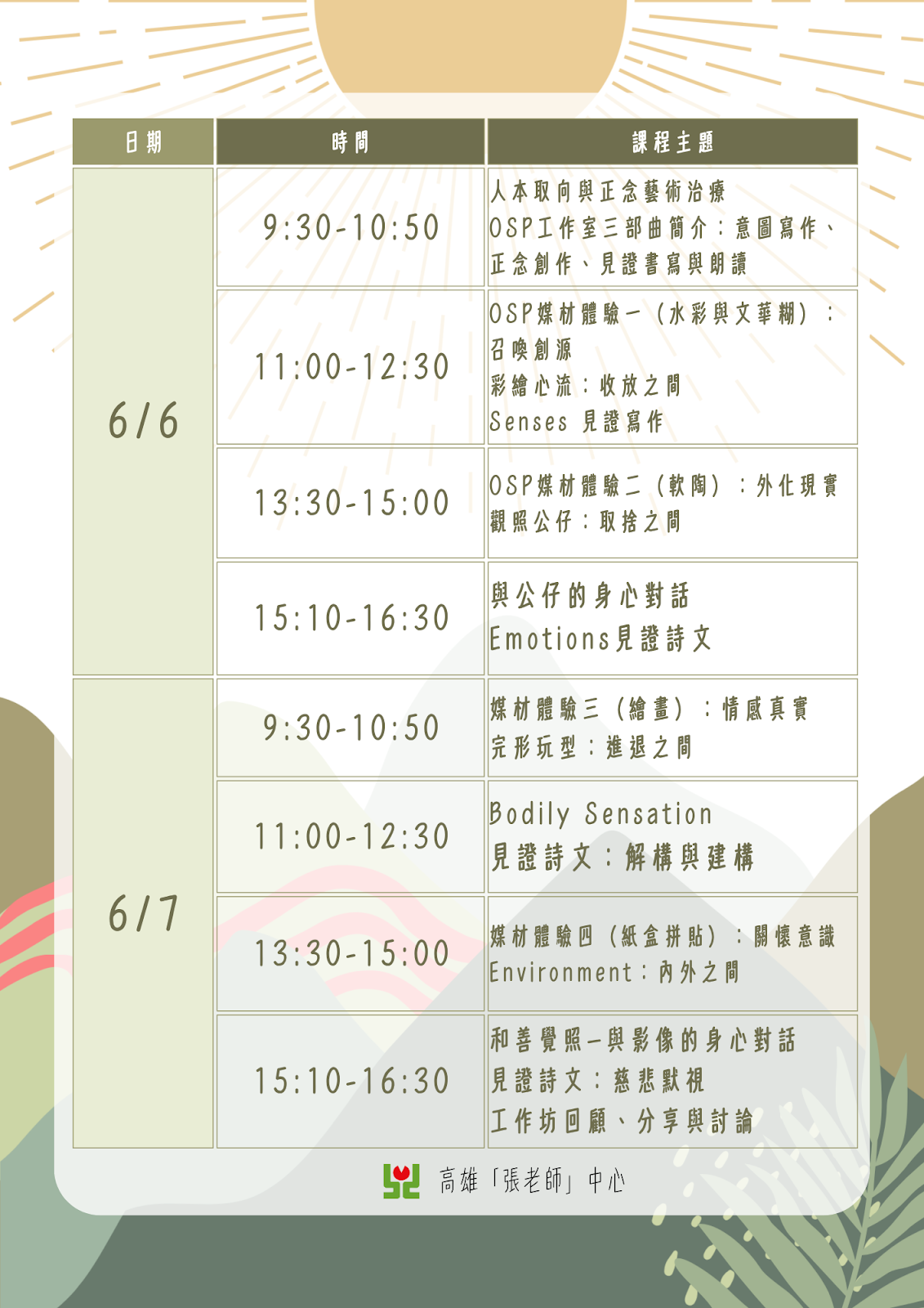 | 課程名稱: | 【高雄】「正念創作,心癒寫作」: 個體&團體關照工作室三部曲 |