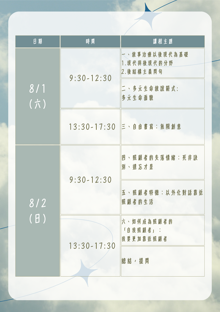 | 課程名稱: | 【高雄】陪伴彼此,走的更遠:照顧者的自我照顧―以敘事治療為基礎 |