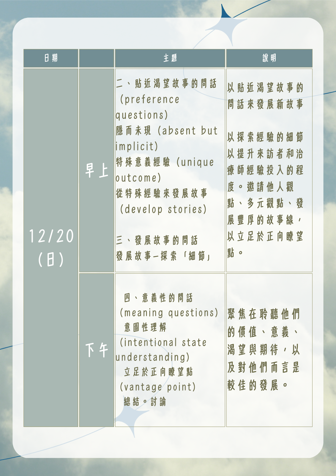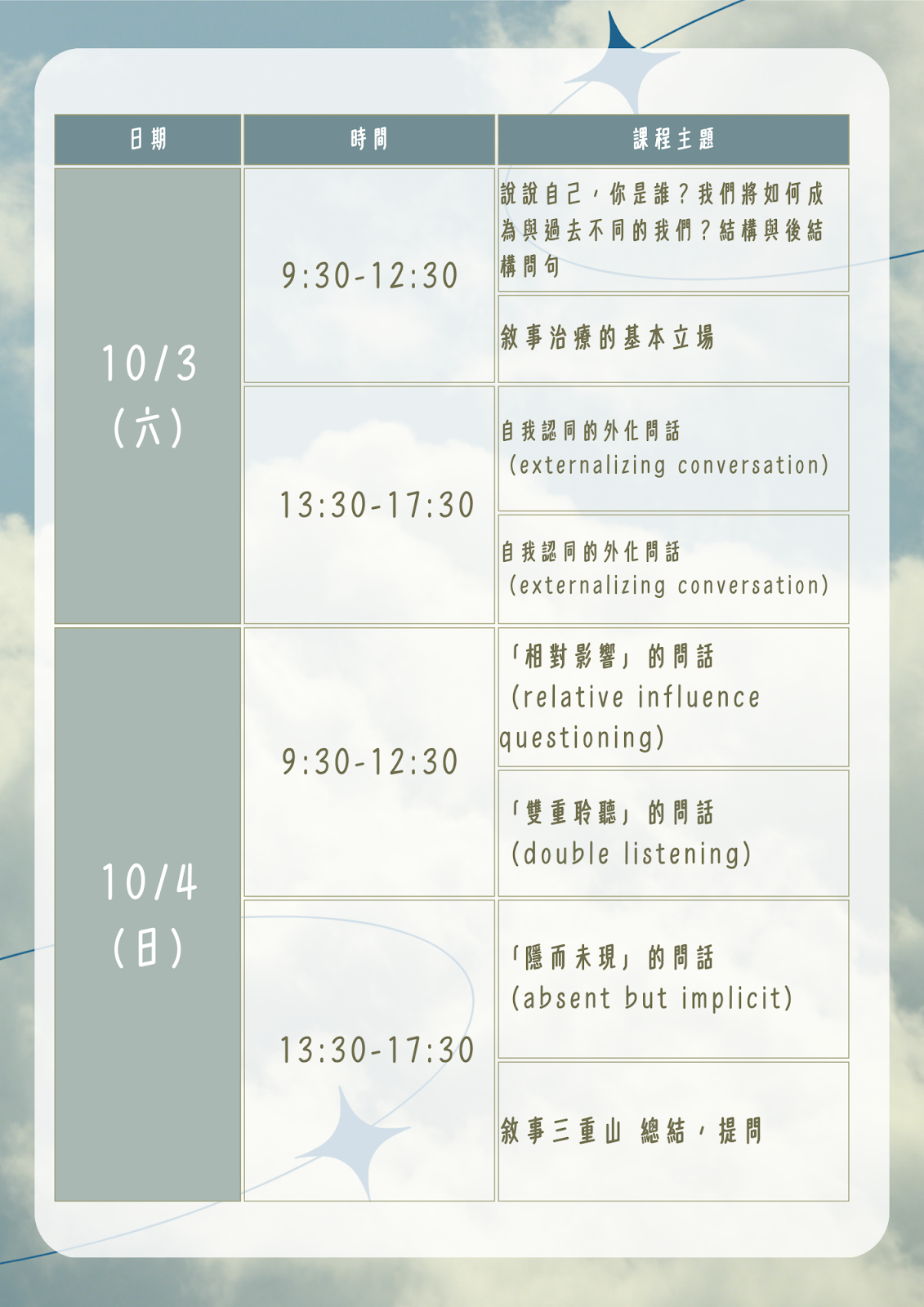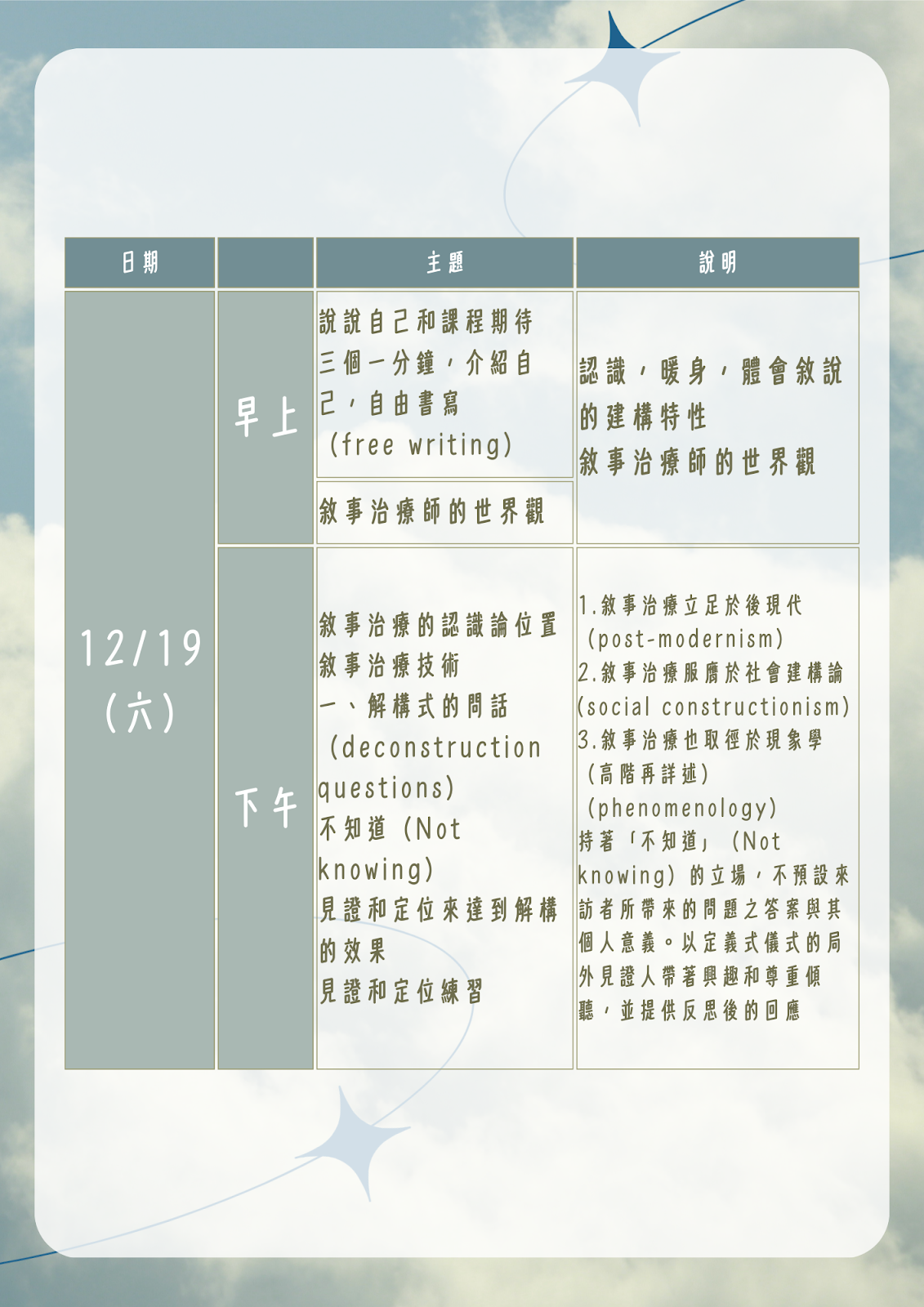 | 課程介紹: | 官網報名不代表報名成功,請詳閱簡章內容及點入 報名網址:https://forms.gle/B7RwisHnaVwKsizH6進行報名 ✦ 【初階】課程介紹 課程目標:以後現代視角觀,奠定敘事治療基本假設,學習敘事治療的方法。 課程主題與內容: