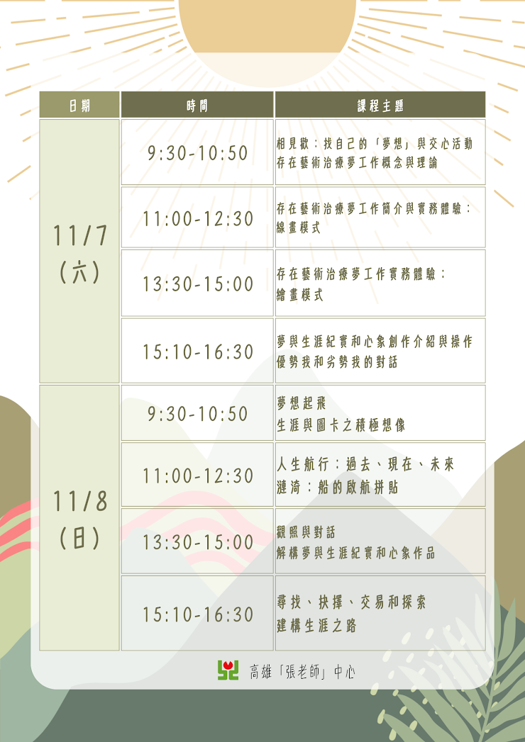| 課程名稱: | 【高雄】夢與夢想: 存在夢工作與生涯藝術治療實務工作坊 |