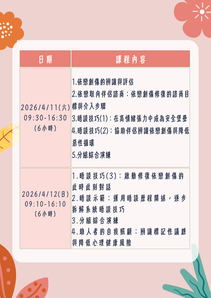 | 課程名稱: | 【高雄】伴侶諮商實務-依戀創傷修復工作坊 |