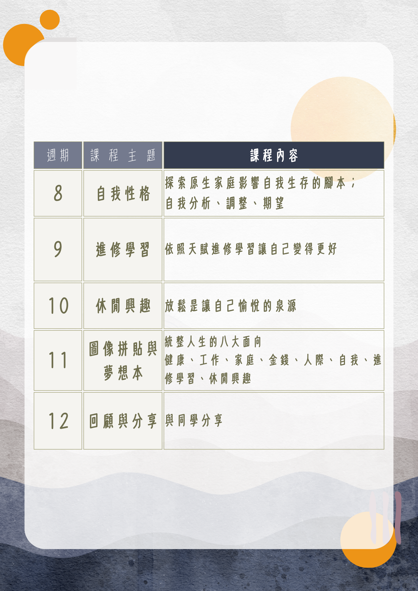 | 課程介紹: | 官網報名不代表報名成功,請詳閱簡章內容及點入 報名網址:https://forms.gle/5cd2jQLcrdrs8Fyy6進行報名 讓生活與工作平衡、擁有身心健康,能靈活調適各種生活壓力,重拾生命的