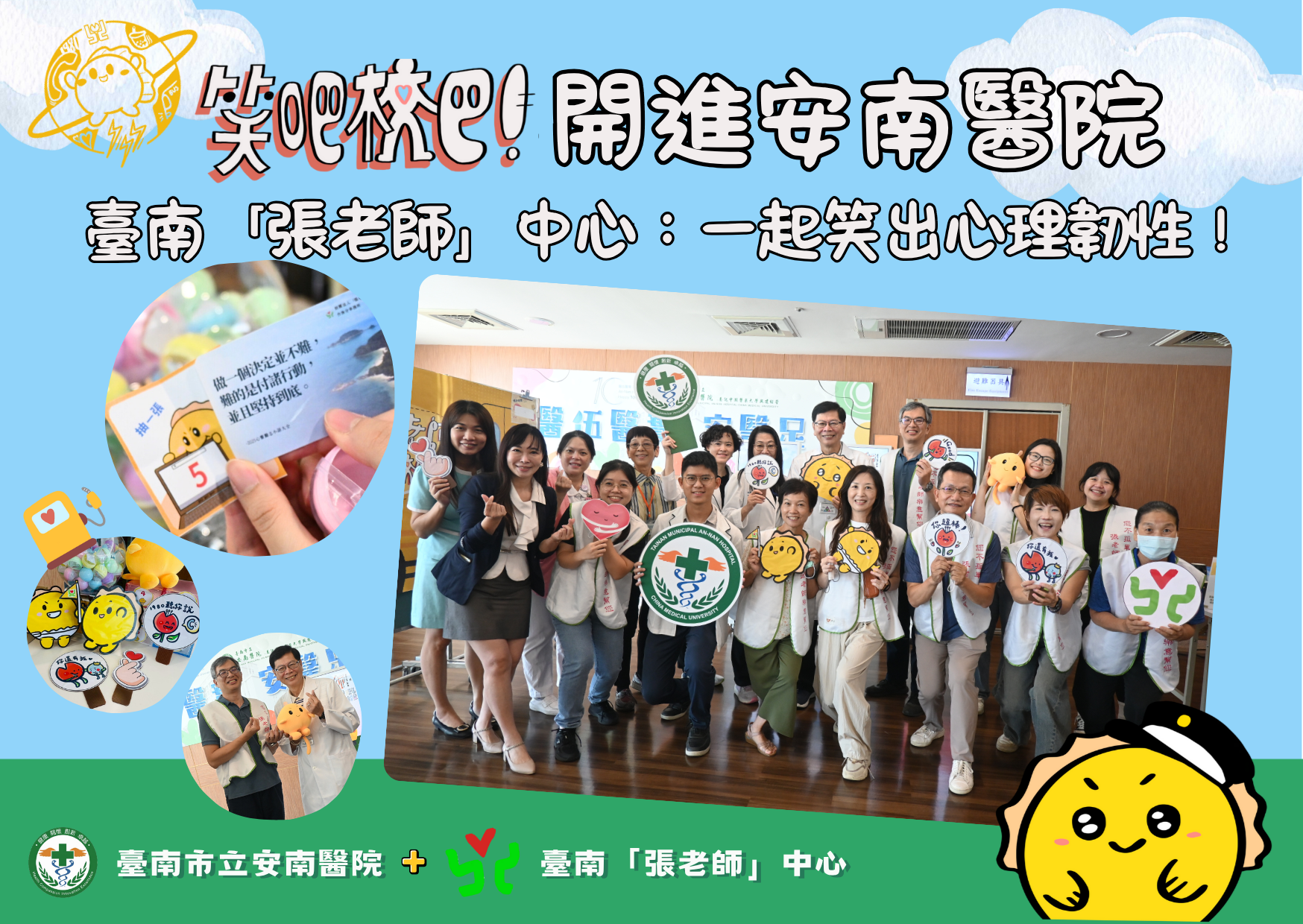 現代社會快速變遷、壓力不斷的生活中,我們常常關心身體健康,卻容易忽略「心理的安適」同樣重要。為響應10月世界心理健康月,臺南「張老師」中心與臺南市立安南醫院攜手合作,於10月17日舉辦一日快閃「笑吧!校巴」心理健康活動,安南醫院院長林聖哲醫師表示,安南醫院秉持「全人關懷」的理念,深信「身體的健康」與「心理的安適」密不可分,期盼透過輕鬆、有趣又暖心的活動體驗,陪伴醫護紓壓,也提供陪病家屬心理支持,讓大家在忙碌的工作節奏中,有機會放慢腳步、傾聽內在,讓更多人認識心理健康求助資源的重要,並建立更有溫度的職場文化。